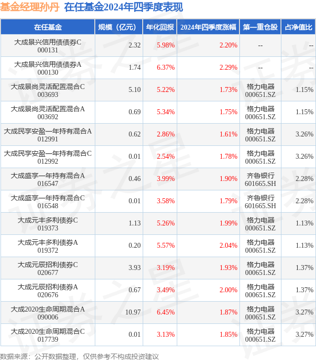2025-09-20米兰体育,米兰体育官方网站,米兰体育APP下载证券之星消息,日前大成2020生命周期混合C基金公布四季报,2024年四季度最新规模0.01亿元,季度净值涨幅为1.85%。