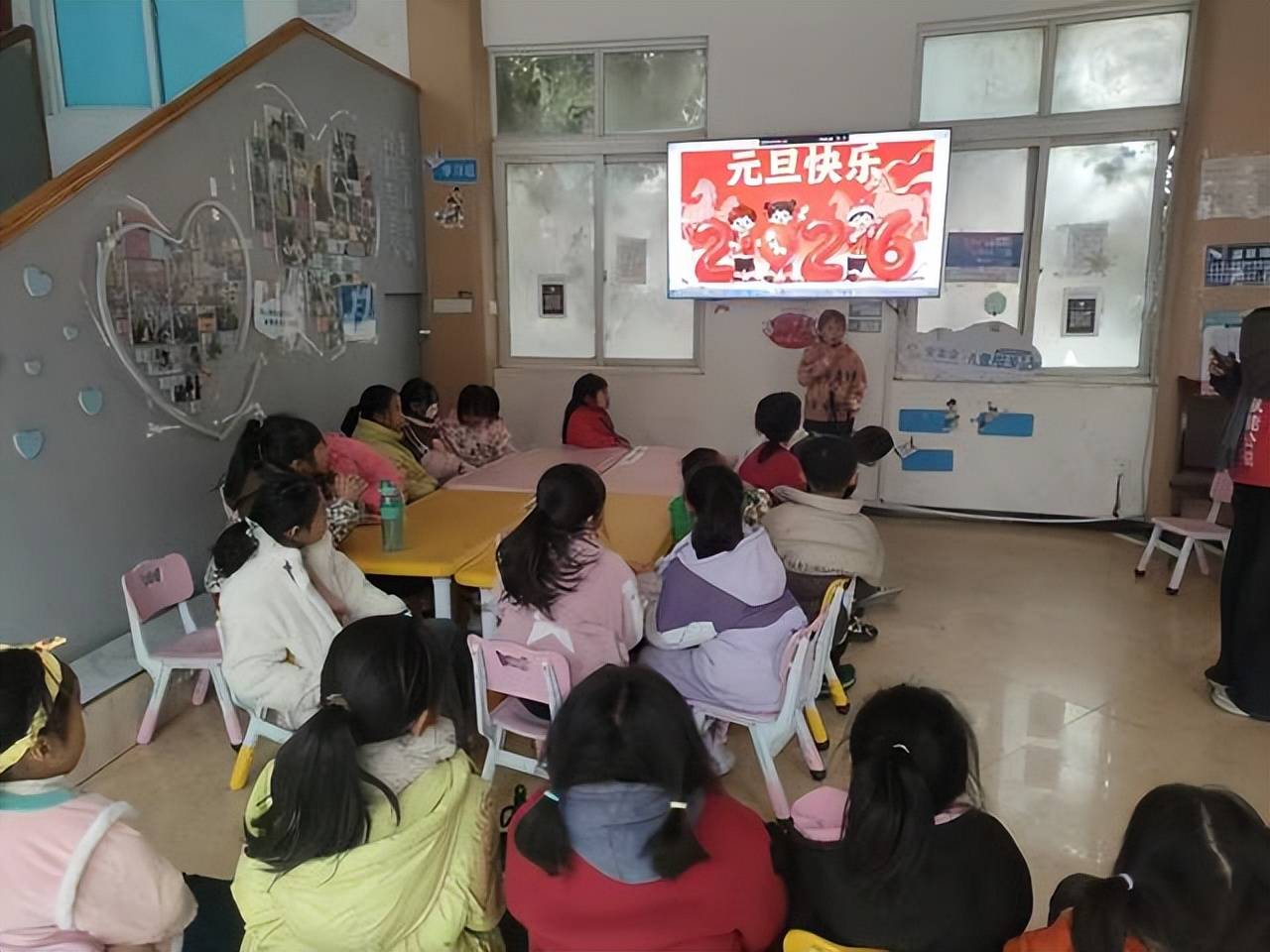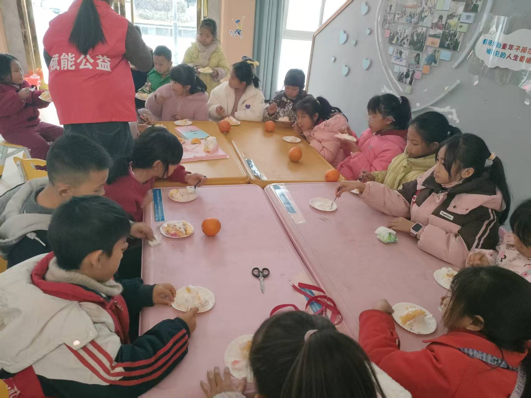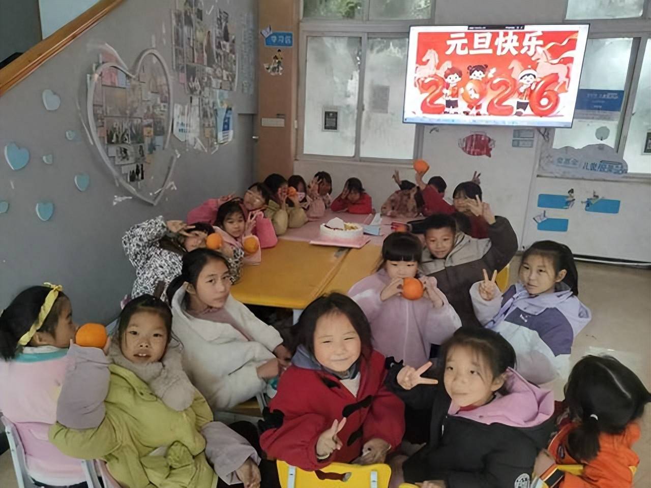 联欢会的高潮,莫过于温馨感人的集体生日会环节。当志愿者们拿着精心准备的大蛋糕缓缓入场时,孩子们瞬间欢呼雀跃起来。烛光摇曳,映照着每一张兴奋的小脸。在志愿者带领下,全场齐唱《生日快乐歌》,歌声真挚而温暖。随后,孩子们依次上前,分享这份象征着祝福与成长的甜蜜。大家围坐在一起,品尝着美味的蛋糕,分享着新年的喜悦。这一刻,服务站化身为一个温暖的大家庭。