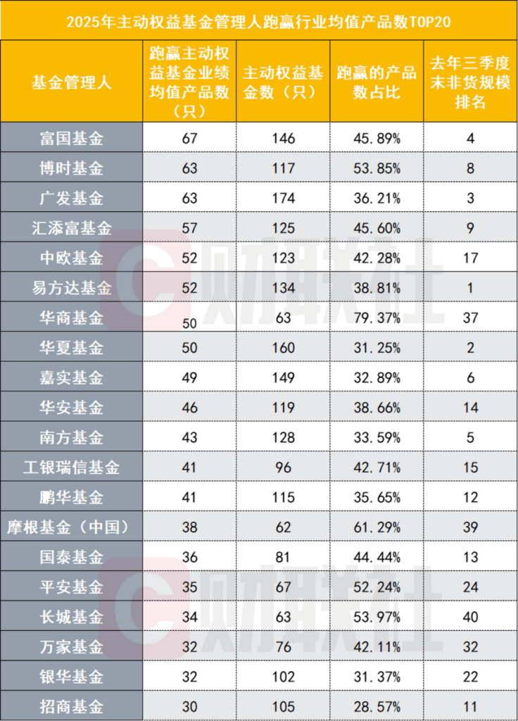 以跑赢均值作为统计口径,正好有20家基金管理人旗下有超过30只主动权益基金被纳入,在TOP20的基金管理人榜单中,富国基金旗下跑赢行业均值的主动权益基金数量最多,达到67只。
