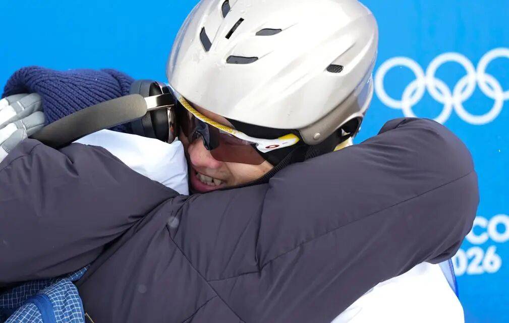 2月20日,王心迪(右)和妻子徐梦桃在比赛中拥抱。在意大利利维尼奥举行的米兰-科尔蒂纳冬奥会自由式滑雪男子空中技巧决赛中,中国选手王心迪和李天马分获冠军和季军。